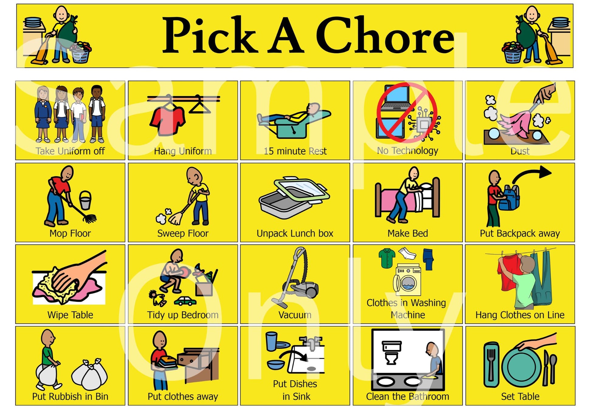 Keep routines fresh and flexible with Pick A Chore, the latest addition to our chore chart series. Designed for busy households and support environments, this chart introduces new chore visuals and clear instructions to help children and individuals choose tasks independently and confidently.